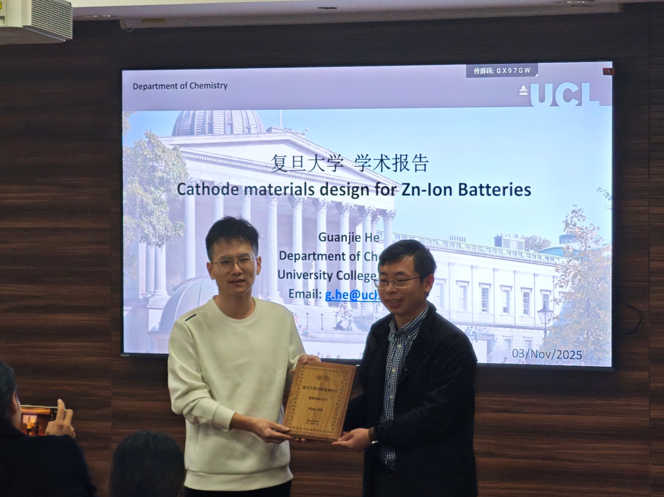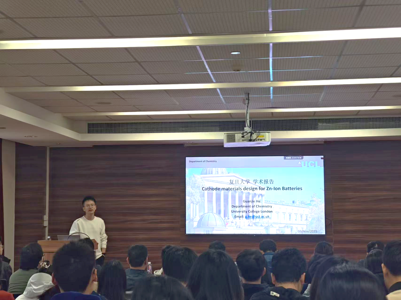 11月3日下午,“91直播 建系百年系列学术报告之光华论坛第八讲”在江湾校区91直播 楼A7032报告厅顺利举行。本次论坛特邀伦敦大学学院何冠杰教授作了题为“高性能水系锌离子电池的正极材料设计”的学术报告,91直播 李伟教授主持报告会,并代表主办方为何冠杰教授颁发荣誉证书,现场近百名师生参与交流,共同聚焦水系锌离子电池领域的前沿技术与研究突破。
