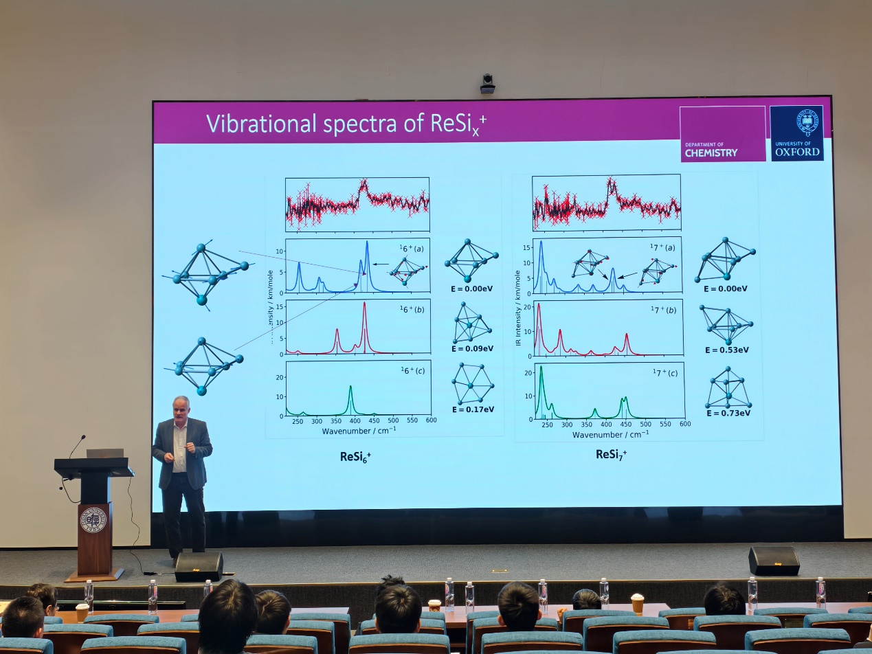 John E. McGrady教授分享了课题组在团簇生长机制及其理论研究方面的最新研究成果,系统阐述了团簇生长过程在连接分子91直播 与纳米材料研究中的关键作用,并指出理解团簇从单个原子逐步演化为复杂二元及三元物相的生长路径具有重要意义。报告重点介绍了团簇生长的两种基本模式,即通过逐个原子添加实现的“原子逐个生长”过程,以及由预先构建的团簇片段经氧化偶联而发生的“团簇融合”过程。围绕上述生长机制,McGrady 教授进一步详细讲解了其团队近年来利用密度泛函理论、多组态自洽场理论及半经验方法等理论计算手段开展的相关研究工作,旨在为团簇生长领域中结构特征与光谱数据的理解与解析提供系统的理论框架。